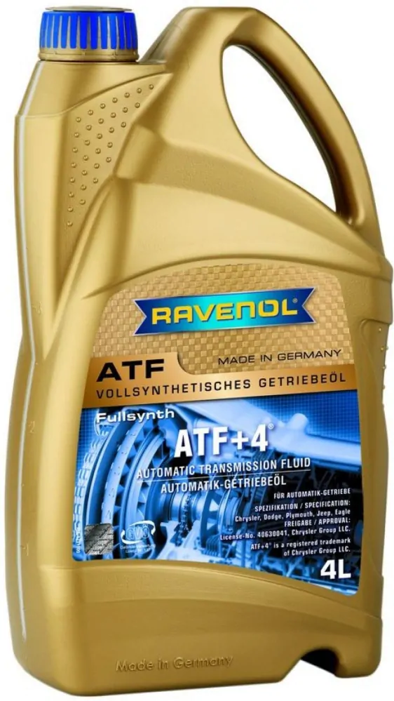 Ravenol ATF +4 Fluid je syntetický převodový olej ATF s licencí pro DaimlerChrysler automatické převodovky nejnovější generace s jedinečnými aditivy pro vozidla Chrysler, Dodge, Plymouth, JEEP, Eagle. Kapalina je také vhodná pro Jeepy do servořízení místo originálního oleje MOPAR PSF, kde se nesmí používat standardní Dexron. Všechny Jeep Wrangler mají od roku 2003 doporučený olej pro servořízení ATF +4.