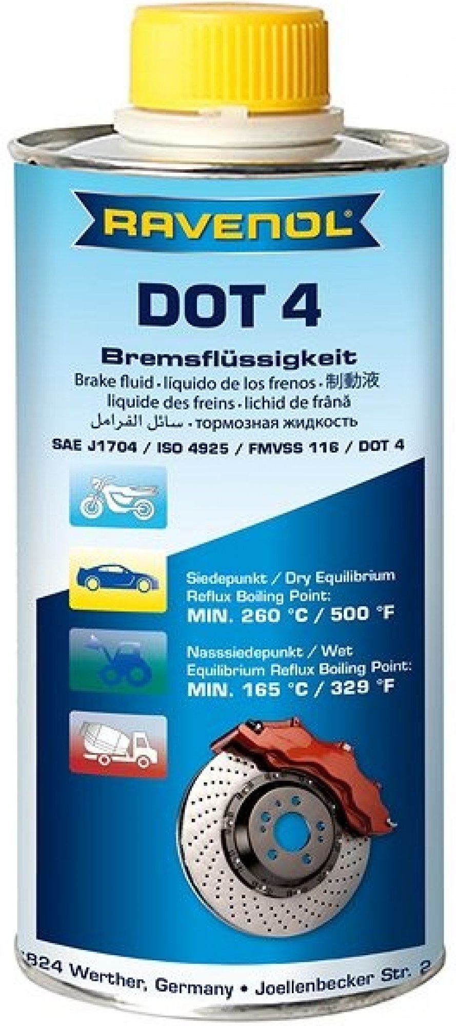 RAVENOL DOT 4 je brzdová kapalina pro použití ve všech vozidlech s optimálními vlastnostmi ABS. Je chemicky stabilní a obsahuje přísady, které zajišťují maximální mazací schopnost. Lze použít ve všech vozidlech, ve kterých je vyžadována specifikace DOT 4 pro brzdové kapaliny. Vhodné pro všechny hydraulické brzdové systémy se syntetickou kapalinou.