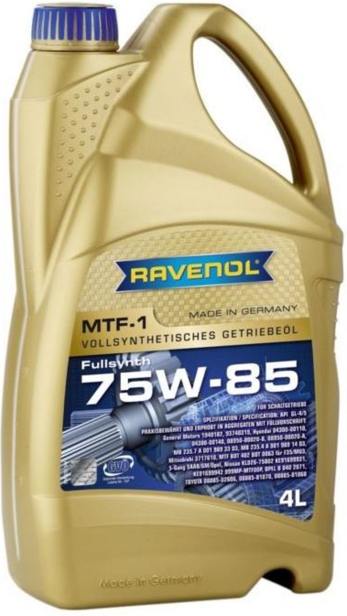RAVENOL MTF-1 75W-85 4L je speciální plně syntetický převodový olej na základě PAO pro manuální převodovky a diferenciály. Je založen na bázi syntetických základových olejů s jedinečnými speciálními přísadami. V praxi vysoko předčil požadavky na současné typy převodových olejů. Je vhodný i pro velmi vysoké mechanické a tepelné zatížení převodových olejů, dokonce i při nejdelších intervalech výměny olejů.