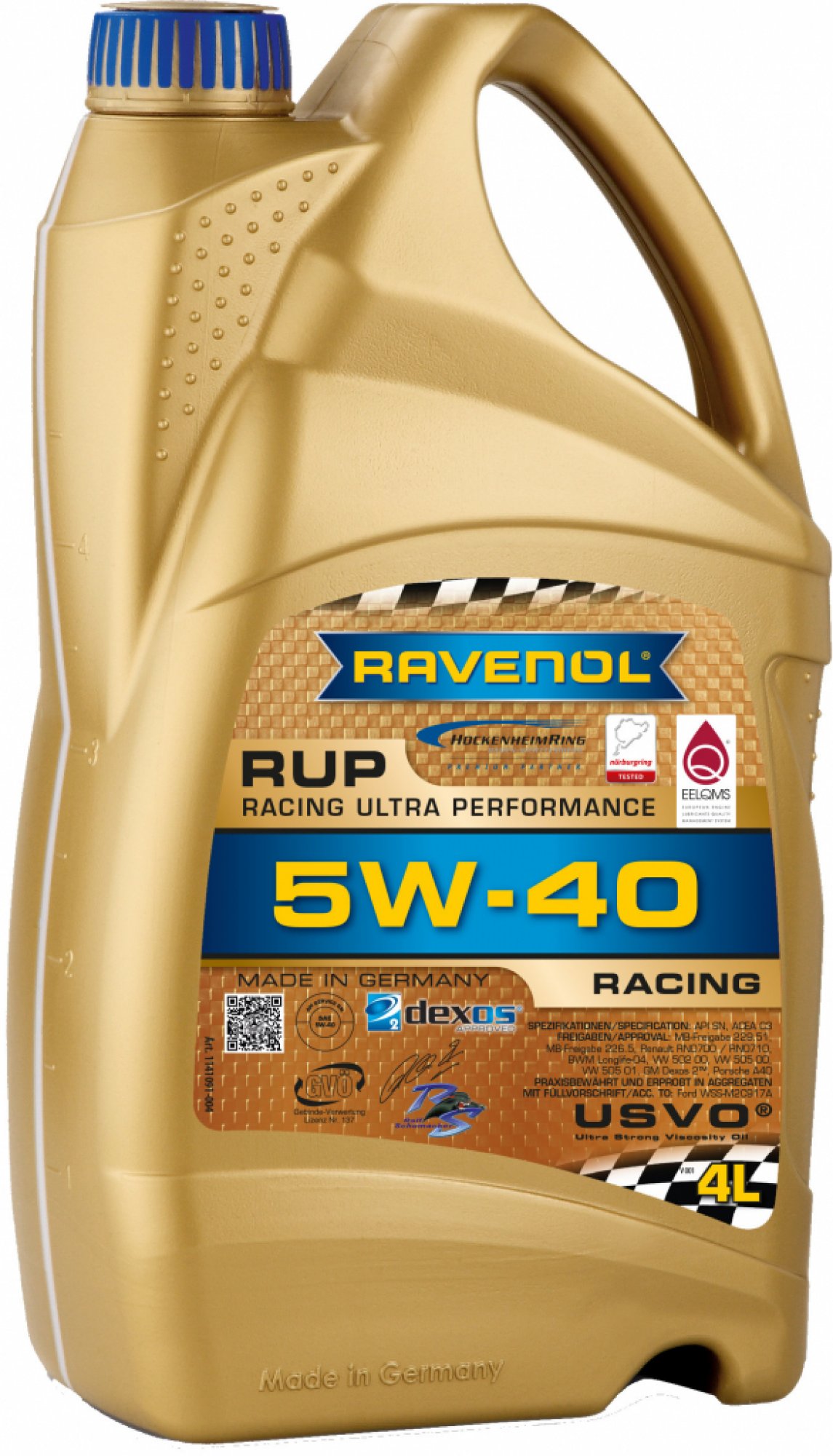 RAVENOL RUP 5W-40 je moderní, plně syntetický vícestupňový motorový olej na bázi PAO (poly-alfa-olefin) s technologií USVO® Technology. RAVENOL RUP 5W-40 je ideální pro benzínové motory závodních automobilů, a to i při nejvyšších zatíženích.Technologie USVO® nabízí vysoký výkon, lepší ochranu motoru, snížení spotřeby paliva a optimální čistotu motoru pro vaše vozidlo. Díky speciální směsi syntetických vysoce polárních základních olejů skupiny V s vysokým podílem PAO s vysokou a nízkou viskozitou je možno formulovat bez použití přísad viskozitního indexu. Vzhledem k vysokému indexu viskozity, vysoké hodnotě HTHS, extrémní střihové stabilitě a vysoce účinnému speciálnímu aditivnímu doplňování s molybdenem a wolframem je RAVENOL RUP 5W-40 vhodný i pro extrémně sportovní jízdní styl.