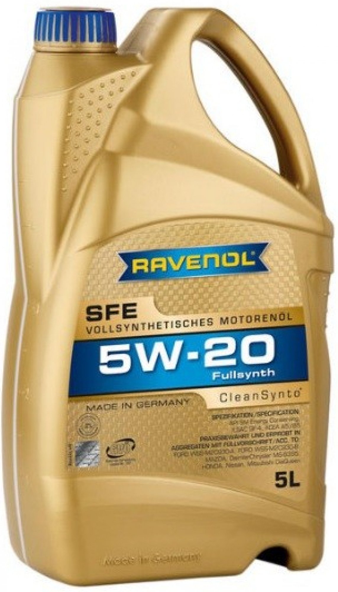olej motorový, syntetický, balení 5 litrů, specifikace: SAE 5W-20, API SP (RC), ILSAC GF-6A, ACEA A5/B5, Jaguar Land Rover STJLR.03.5004, Ford WSS-M2C930-A, Ford WSS-M2C930-B, Ford WSS-M2C925-A/B, Ford WSS-M2C948-B, Chrysler MS-6395, Honda/Acura.. RAVENOL SFE 5W-20