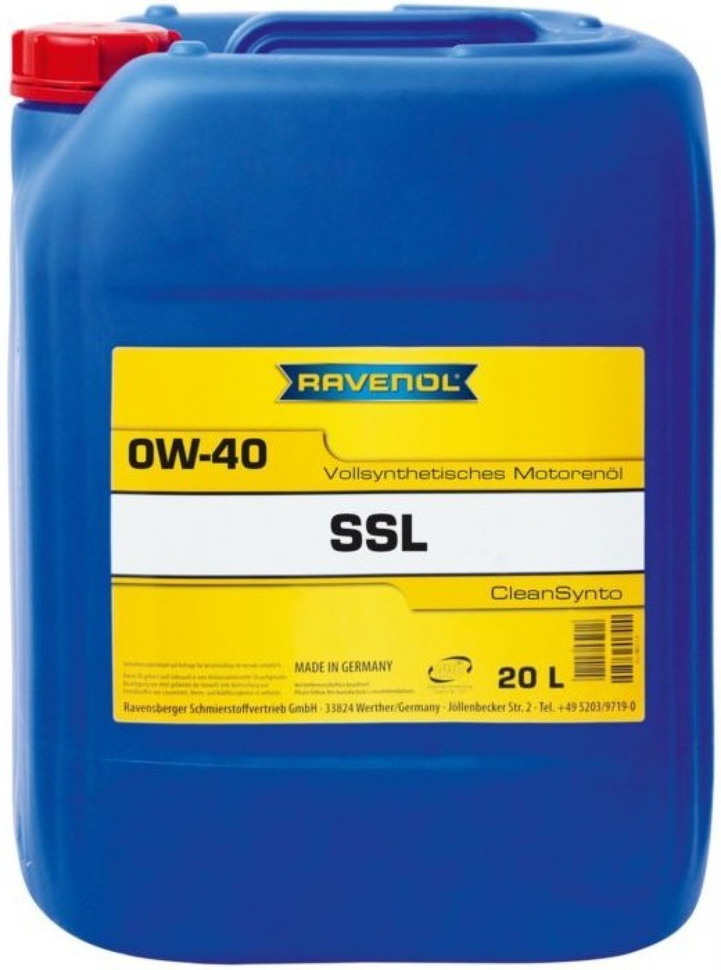 olej motorový, syntetický, balení 20 litrů, specifikace: API SN/CF, ACEA A3/B4, MB 229.5, Renault RN0700, RN0710, Porsche A40, VW 502 00, VW 505 00, BMW Longlife-01, API SN, MB 226.5, MB 229.3, Fiat 9.55535-M2, Chrysler MS-12633, MS-10725... RAVENOL SSL 0W-40