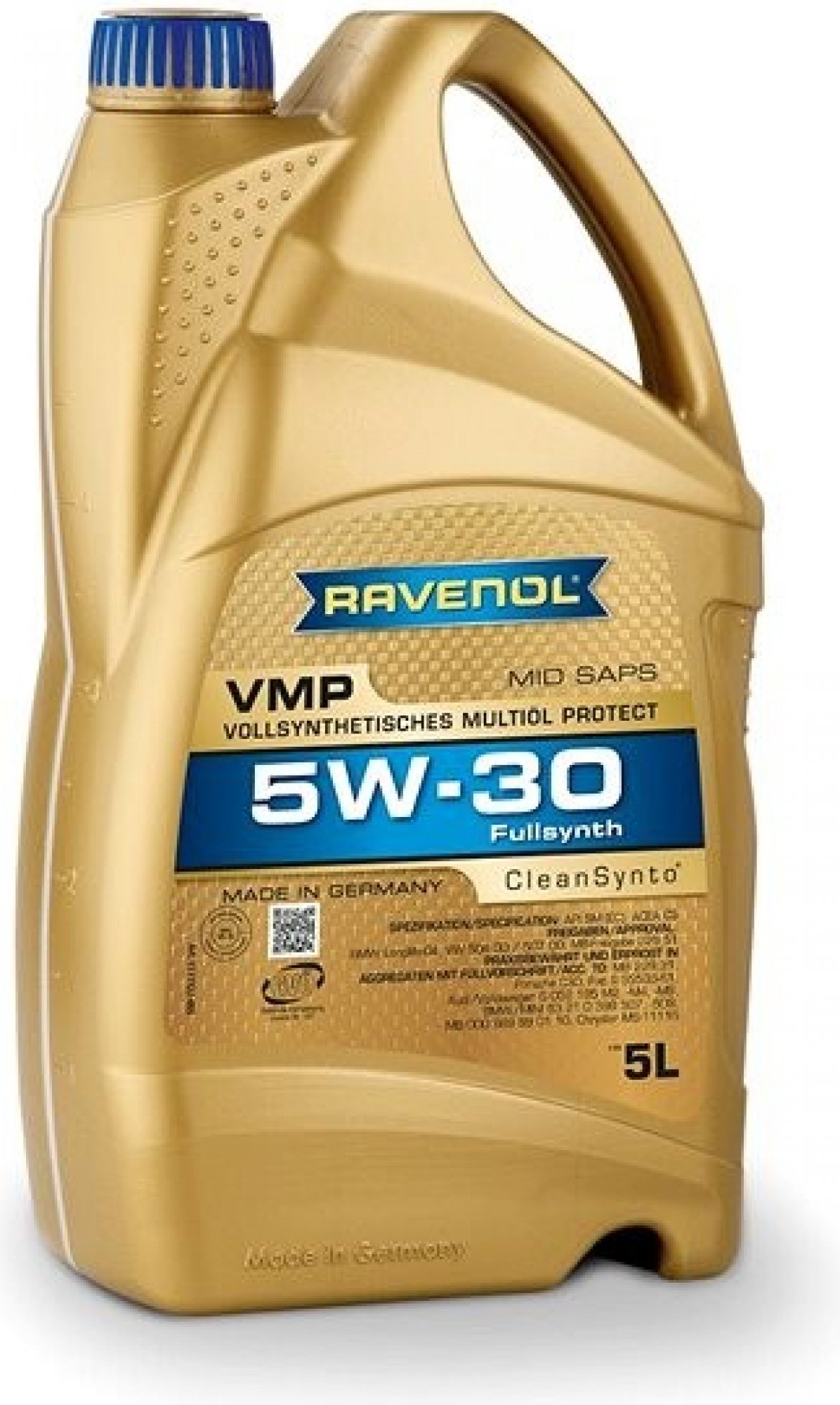 Vhodný pro delší intervaly výměny oleje, doporučené výrobcem. RAVENOL VMP 5W-30 je založen na látkách s nízkým obsahem popela.