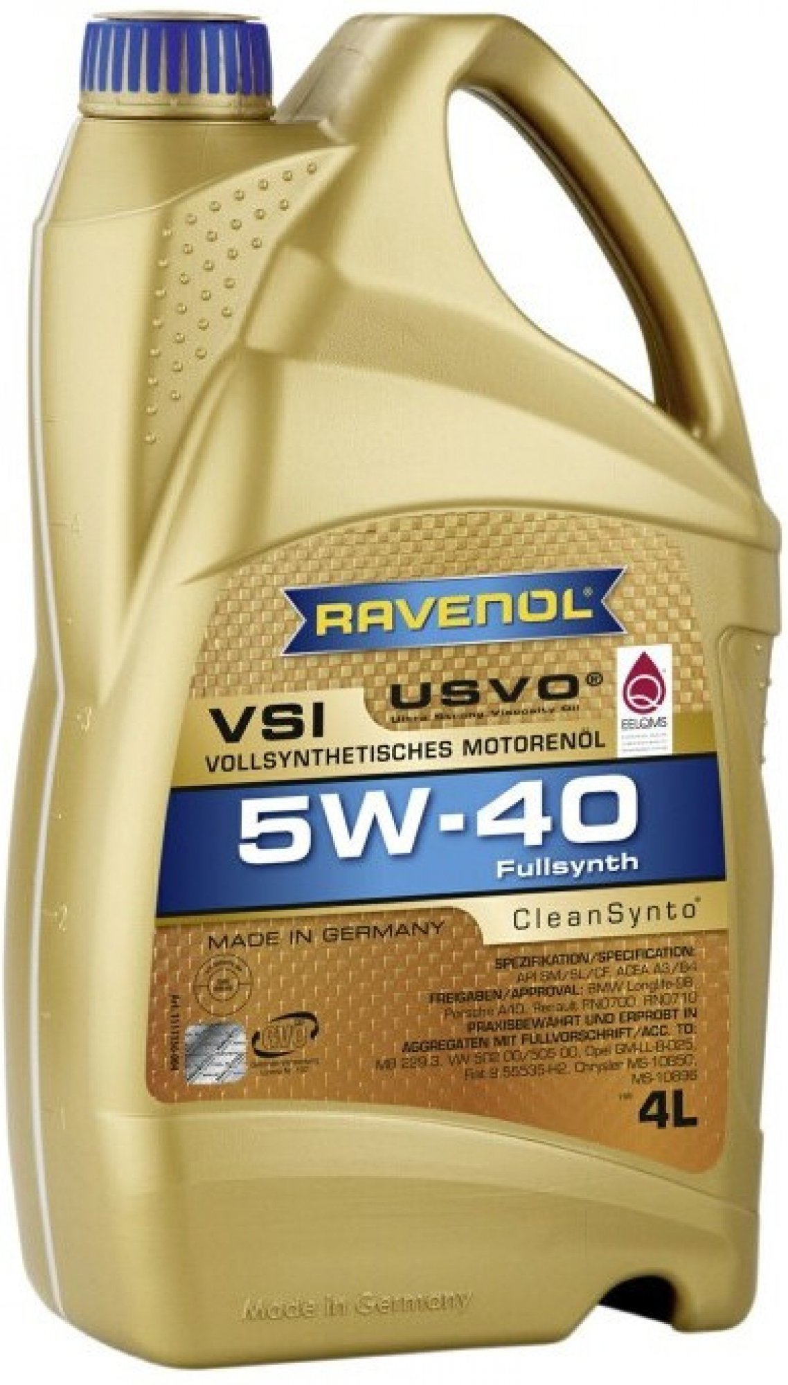 olej motorový, syntetický, balení 4 litry, specifikace: SAE 5W-40, API SN/CF, ACEA A3/B4, MB 229.3, VW 502 00/ VW 505 00, Porsche A40, Renault RN0700/RN0710, MB 226.5, BMW Longlife-01, Opel GM-LL-B-025, Fiat 9.55535-H2, Chrysler MS-10850, MS-10896 RAVENOL VSI 5W-40